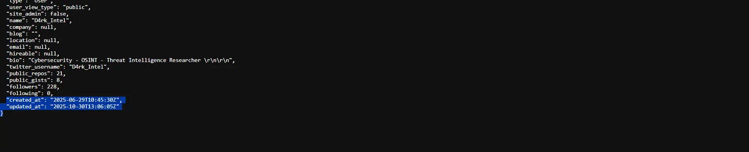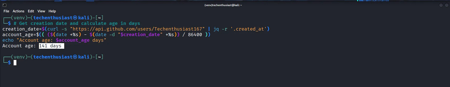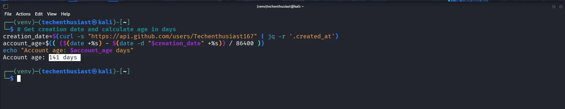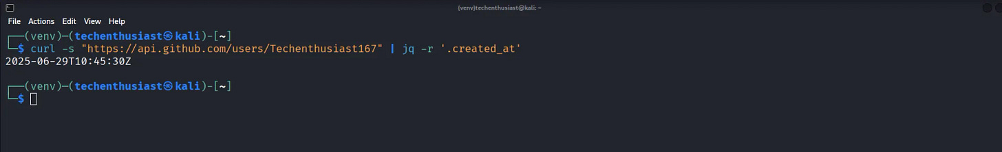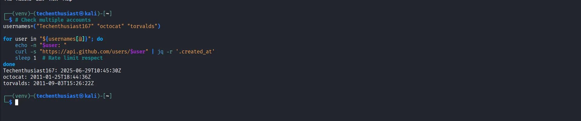 curl -s “https://api.github.com/users/Techenthusiast167” | jq -r ‘.created_at’Check if user exists and get creation date: