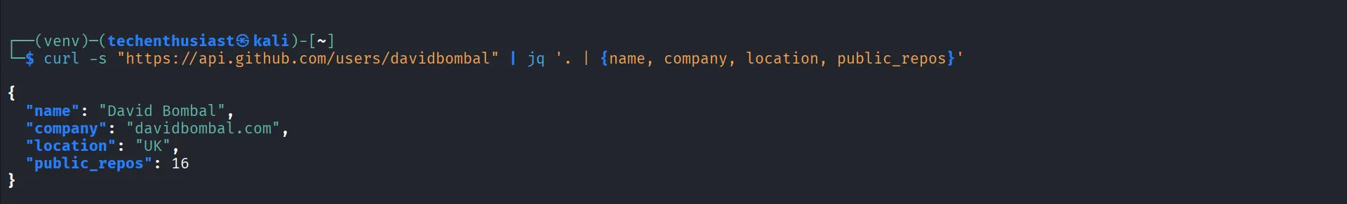gh api users/Techenthusiast167 --jq ‘. | {username: .login, created_at: .created_at, public_repos: .public_repos}’Direct curl Equivalent